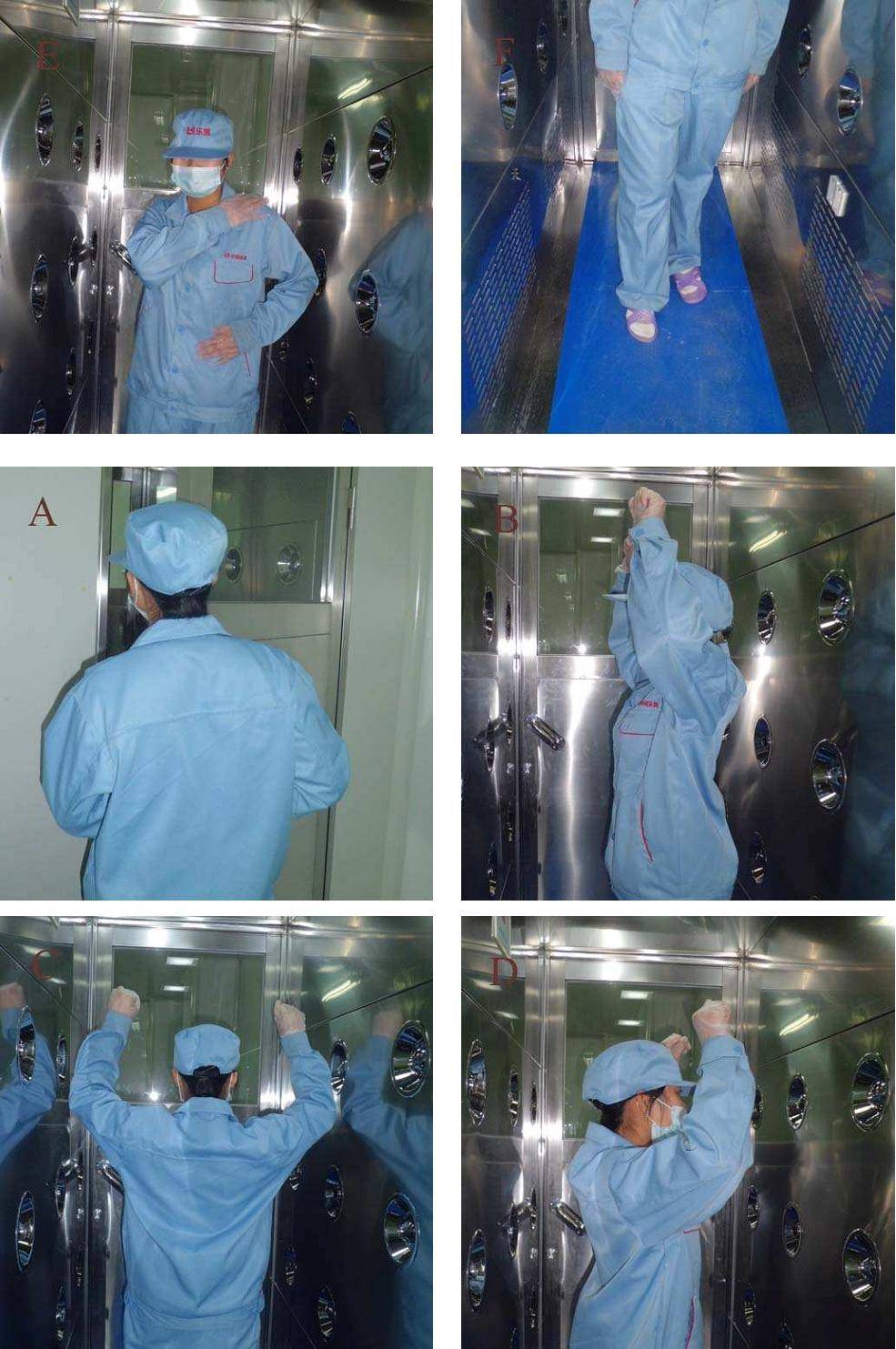 便于全方位除塵(圖B﹑C﹑D);拍打身體(E);在粘塵墊上踏步三次,除去腳上灰塵(圖F)。